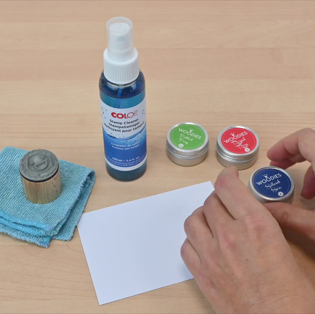 1️⃣ Clean the stamp: Place the stamp on a paper towel and spray the cleaner directly onto the printing plate.