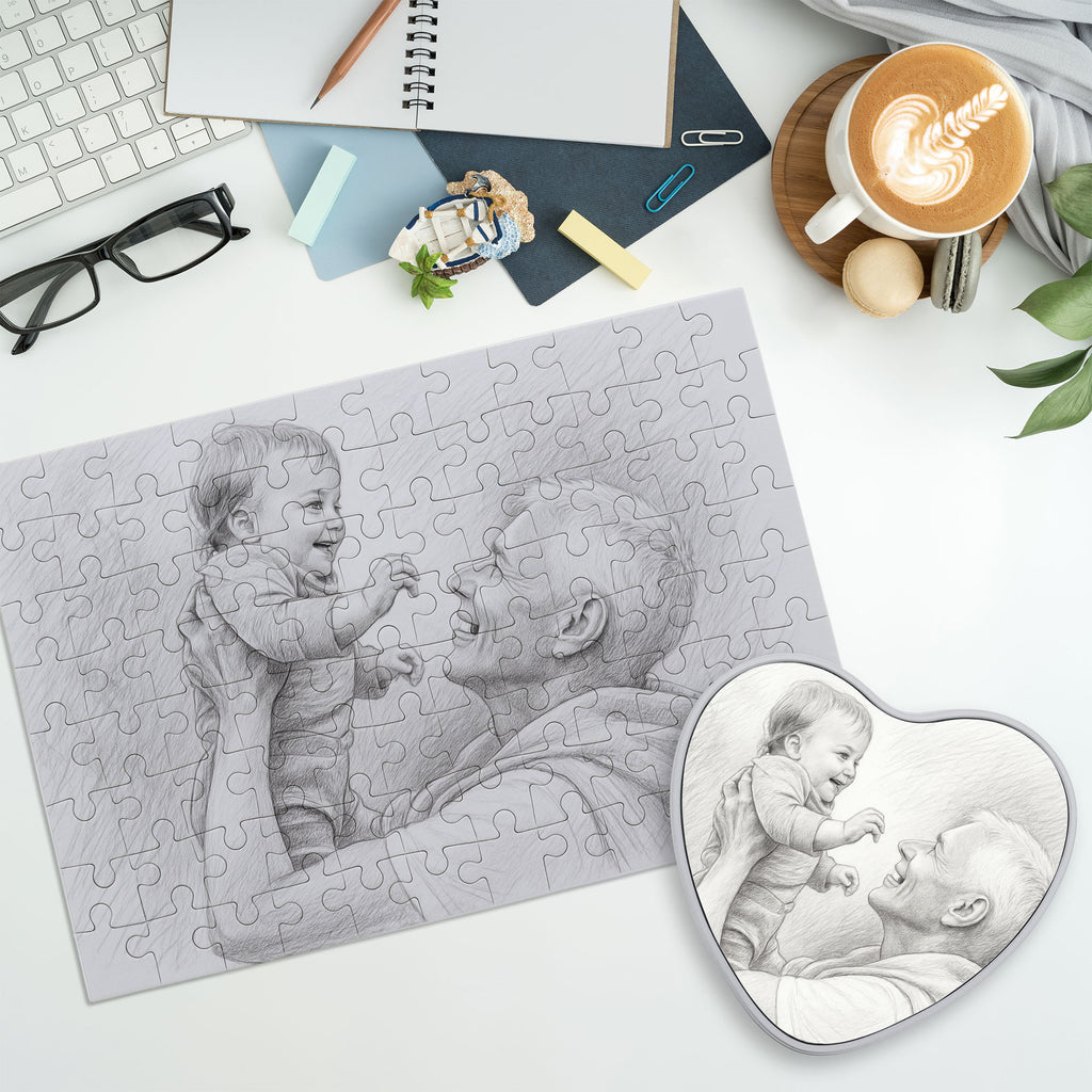 Give a truly unique gift: a puzzle with a pencil drawing ✏️ created from your own photo! Simply upload your favorite image 📸 – we'll create a fine, detailed black and white drawing that will be printed exclusively on your puzzle. As you piece it together, the motif unfolds piece by piece, creating a particularly emotional experience. 🧩🤍