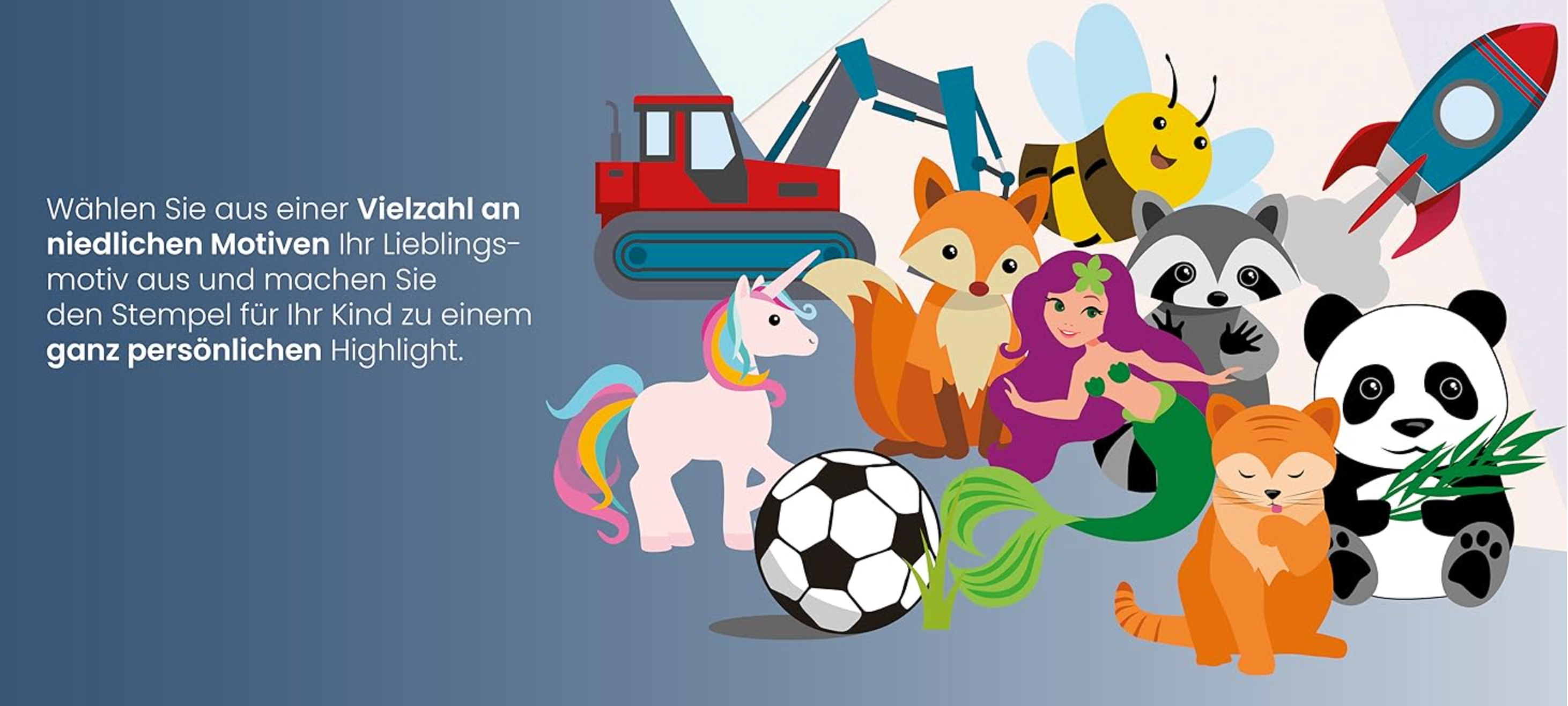 Discover our enchanting fabric stamps with children's designs and custom text – the perfect solution to personalize and mark your little ones' clothing, hats, bags and other textiles individually. This ensures that nothing gets lost and gives your children's textiles a personal touch. And as a gift for birthdays, school enrollment, Easter or Christmas, our fabric stamps are ideal. Whether it's a kindergarten child or elementary school student, our fabric stamps are suitable for children of all ages.